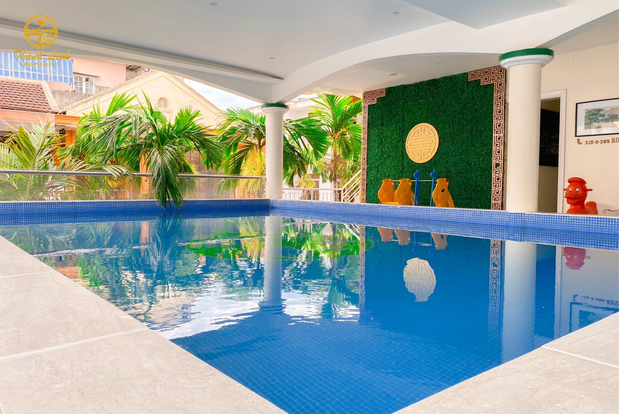 Bể bơi là một điểm nhấn của Khách sạn Thanh Lịch. Tuy bể bơi không quá rộng nhưng sở hữu không gian thiên nhiên xanh mát bên những tán cây cọ. Không gian bể bơi nằm dưới hiên rộng, đảm bảo du khách được trải nghiệm những giây phút vui vẻ bên làn nước mát mà không bị ảnh hưởng bởi thời tiết, nhưng vẫn hài hòa trong không khí trong lành của thiên nhiên miền Trung.
