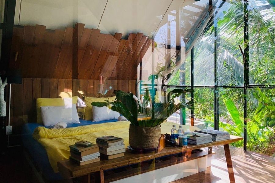 Nội thất bên trong phòng được bố trí tối giản và gọn gàng nhất có thể với tone màu chủ đạo là màu trắng, giúp nổi bật lên nét sảng khoái, mát mẻ của khu vườn xanh tươi bên ngoài. Phòng được trang bị các tiện ích sinh hoạt, giải trí như: wifi tốc độ cao, phòng tắm riêng,…cực kỳ thuận tiện và thoải mái cho du khách khi nghỉ tại đây.