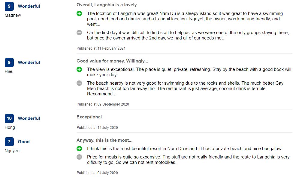 Sở hữu vẻ đẹp của thiên nhiên ban tặng, sự dân dã, hoang sơ trong lối kiến trúc bungalow đều mới lạ. Langchia Nam Du Resort xứng đáng là điểm đến đầy hấp dẫn, hoàn hảo cho chuyến tham quan khám phá quần đảo Nam Du của cả du khách trong và ngoài nước. Bạn đọc có thể tham khảo những đánh giá dưới đây để có cái nhìn khách quan về chất lượng dịch vụ nghỉ dưỡng tại đây và trải nghiệm của những du khách đã nghỉ dưỡng tại nơi đây.