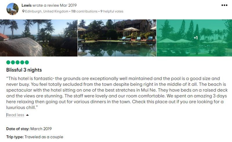 Luôn muốn mang đến cho du khách khi nghỉ dưỡng tại đây những trải nghiệm tuyệt vời, với đầy đủ dịch vụ tiện ích và chất lượng phòng ốc, chính vì vậy mà Little Muine Cottages Resort luôn nhận được những phản hồi tốt của du khách. Hãy cùng Reviewvilla.vn điểm qua 1 vài review nổi bật nhé!