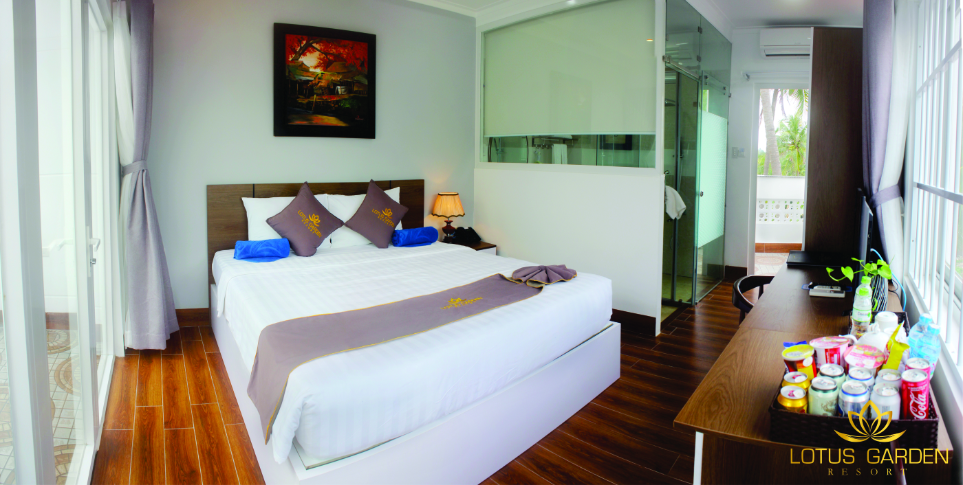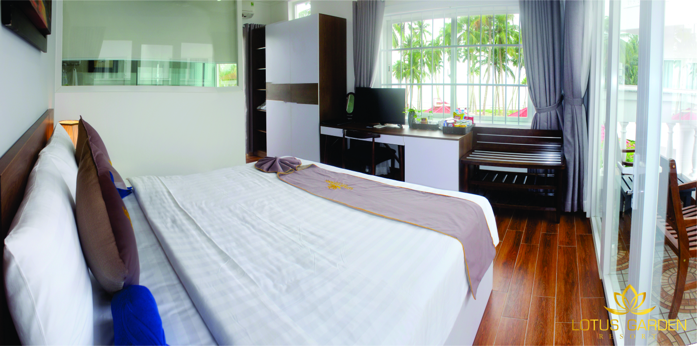 Nằm trên tầng cao nhất của khu nghỉ dưỡng Lotus Garden Resort, sở hữu ban công rộng với view nhìn ra biển, phòng Primier được coi là một trong những phòng đẹp nhất trong hệ thống phòng nghỉ của Lotus Garden Resort Mũi Né.