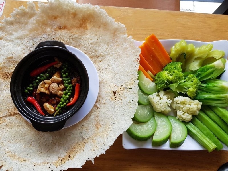 Cơm cháy giòn tan, được làm thành hình dáng của những chiếc bánh mỏng, chấm cùng kho quẹt đậm đà, vô cùng cuốn hút. Thịt ba chỉ cháy cạnh, hòa cùng nước mắm kho quẹt, cùng chút ớt cay cay, cơm cháy giòn tan và rau củ tươi mới, thơm ngọt sẽ là một bữa xế hoàn hảo cho các thực khách.