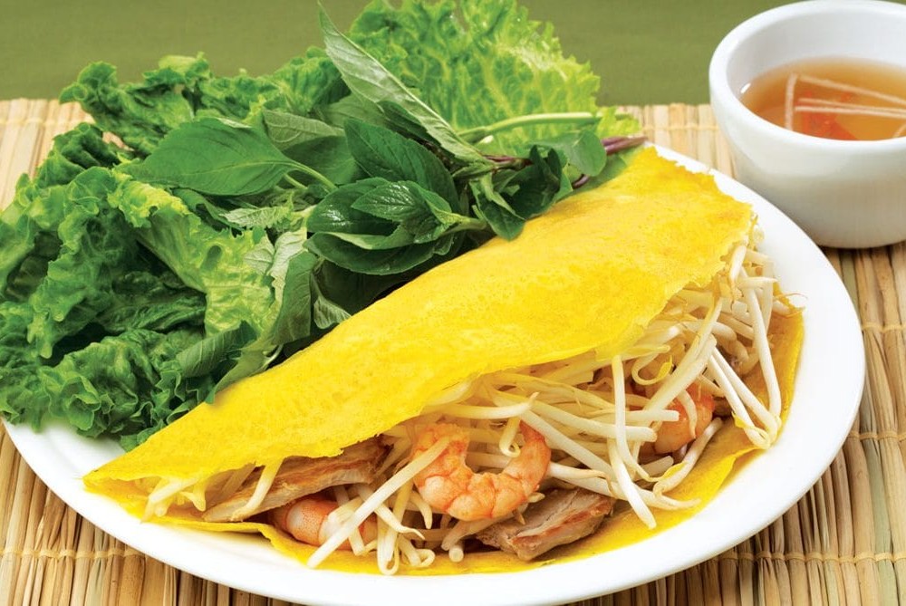 Khi ăn món ngon Sài Gòn, bạn sẽ lấy bánh tráng cuộn bánh xèo với ít rau sống và chấm cùng với nước chấm đậm đà chua cay. Ăn một miếng đầu tiên, bạn có thể cảm nhận được vị thơm, giòn, béo ngậy và chút cay. Quý khách nên gọi thêm cốc trà đá để uống khi ăn bánh xèo nhé.