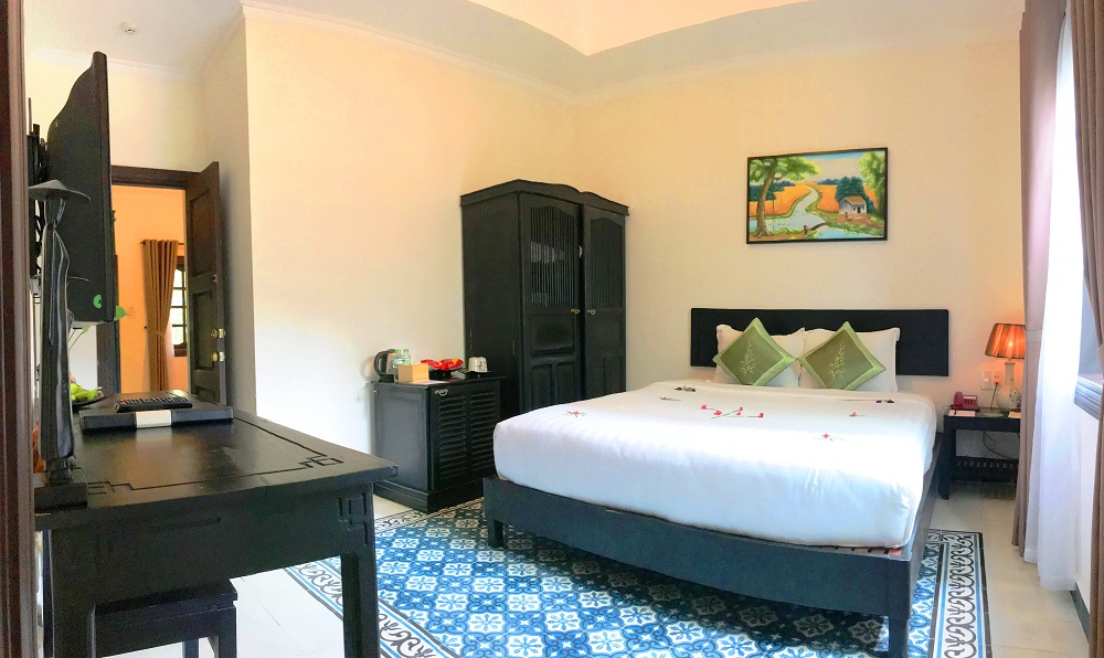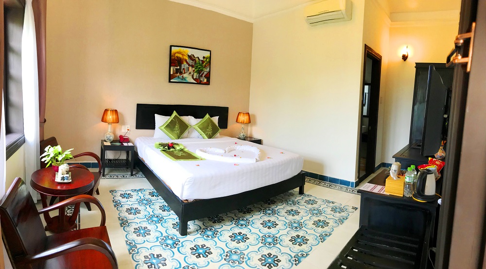 Tổng diện tích sử dụng của phòng Deluxe là 27m2, sức chứa tối đa lên tới 3 người lớn và 1 trẻ em. Là căn phòng vô cùng phù hợp cho gia đình hay những nhóm bạn đang cùng nhau tìm kiếm điểm lưu trú hoàn hảo cho việc nghỉ ngơi, thư giãn và khám phá thành phố Hội An. Khung cảnh hướng vườn, bạn có thể phóng tầm mắt ra xa ngắm nhìn dòng sông thơ mộng hay chiêm ngưỡng hoàng hôn nhẹ buông mỗi buổi chiều tà ngay tại căn phòng này.