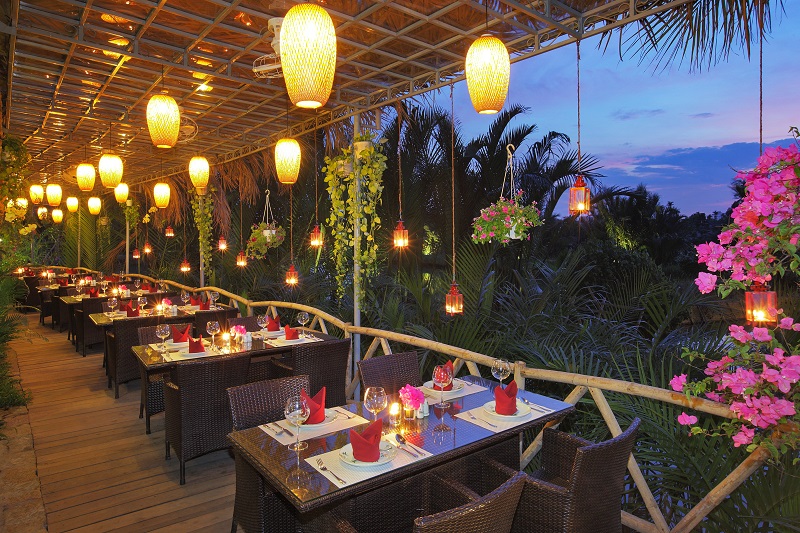 Nhà hàng nổi Nipa Floating trong khuôn viên khách sạn Muca Hoi An Boutique Resort & Spa phục vụ Buffet sáng và cả thực đơn gọi món với menu đa dạng từ các món Việt, châu Á tới châu Âu. Đặc sắc hơn cả là du khách có cơ hội vừa thưởng thức những món ăn ngon hấp dẫn, vừa được tận hưởng không gian thoáng mát, lãng mạn ngay trên sông. Còn gì tuyệt vời hơn khi cùng người thân yêu của mình chiêm ngưỡng vẻ đẹp hoàng hôn hay thả hồn vào quang cảnh thiên nhiên sông biển thơ mộng.