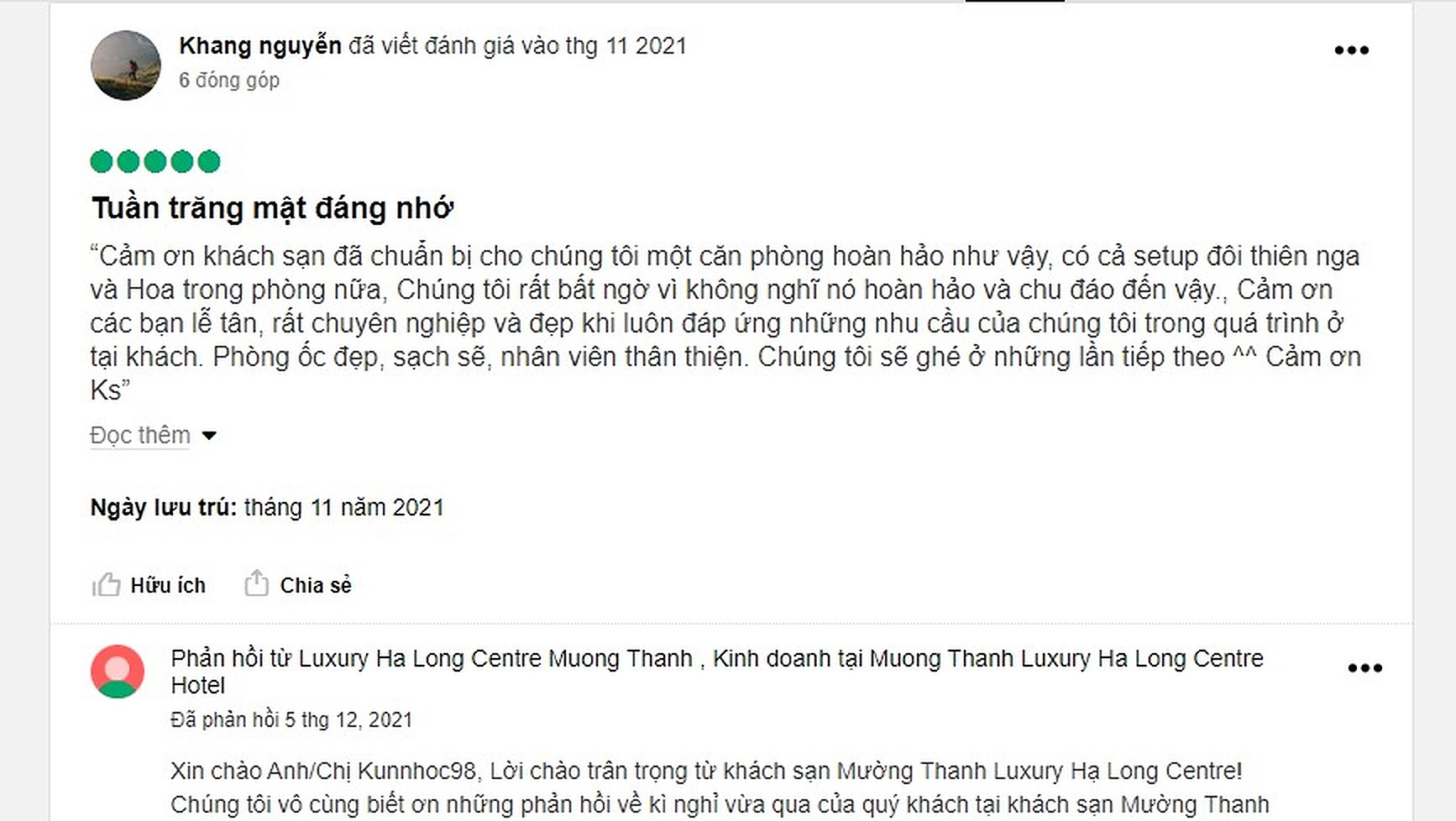 Dưới đây là những đánh giá về Mường Thanh Hạ Long của một số khách hàng mà Reviewvilla.vn chọn lọc để các bạn có thể tham khảo: