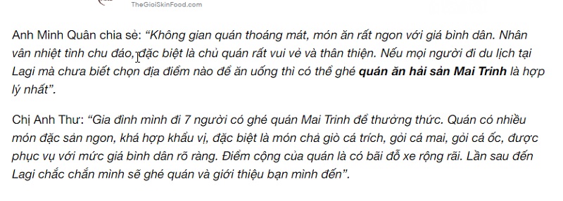 Trên đây là toàn bộ thông tin về nhà hàng Mai Trinh quán Lagi mà Reviewvilla.vn vừa chia sẻ để bạn tham khảo. Hy vọng, bạn sẽ có được một trải nghiệm ẩm thực đáng nhớ nhất khi đến với quán ăn nổi tiếng của Bình Thuận nhé.