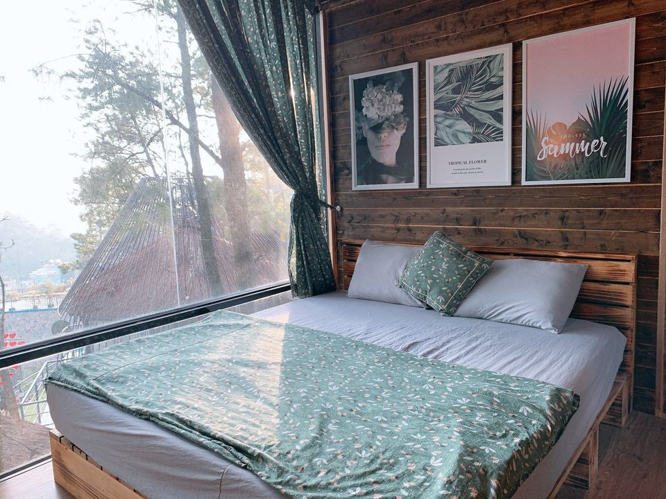 Cùng với chiếc giường lưới nhỏ nhắn xinh xắn, căn nhà cây hai gian mang một vẻ đẹp tropical vô cùng đẹp mắt. Nơi đây hứa hẹn sẽ cho ra những tấm hình sống ảo cực kỳ phiêu du cho du khách đó nha! Căn bungalow nhà cây hai gian bao gồm có 2 phòng ngủ riêng biệt được nối với nhau bằng một ban công rộng rãi với view ôm trọn vẻ đẹp của đội thông. Căn phòng này sẽ vô cùng thích hợp dành cho những nhóm bạn đi từ 2 đến 6 người hoặc những gia đình nhỏ mong muốn có không gian gần gũi với nhau nhưng vẫn giữ được sự riêng tư cho mình.