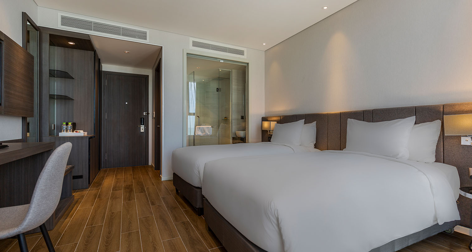 Phòng có diện tích 28m2, với thiết kế tươi mới, tôn vinh được toàn bộ vẻ đẹp tinh tế của nội thất bên trong phòng , với hướng nhìn ra biển Thái Bình Dương yên ả. Phòng được đặt 2 giường semi-queen. Phòng tắm được lát bằng đá cẩm thạch sang trọng, cùng với sàn gỗ.
