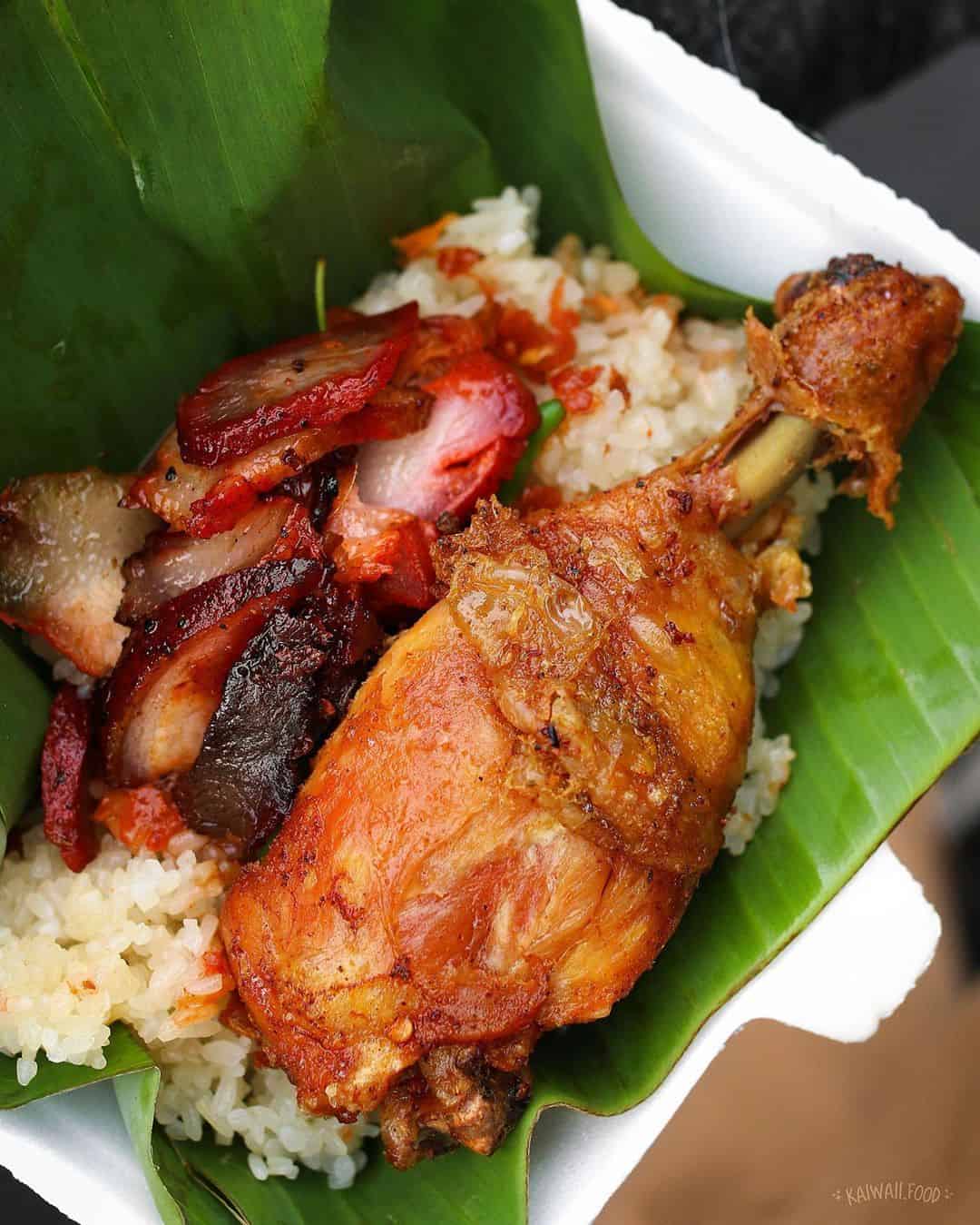 Xôi nơi đây được bao bọc và cuốn gói cẩn thận trong lớp lá chuối tươi màu xanh xanh, vừa tỏa được hương thơm tự nhiên lại vừa giữ nhiệt tốt. Bên cạnh đó, hạt xôi còn vô cùng dẻo mềm, phủ thêm một lớp nước sốt thịt béo ngậy, đậm đà phía trên hòa cùng chút thịt xá xíu ngọt dịu. Ngoài ra, thịt gà thì sẽ được chiên ráo dầu, thấm đậm gia vị đồng thời không bị khô trong lúc thưởng thức.