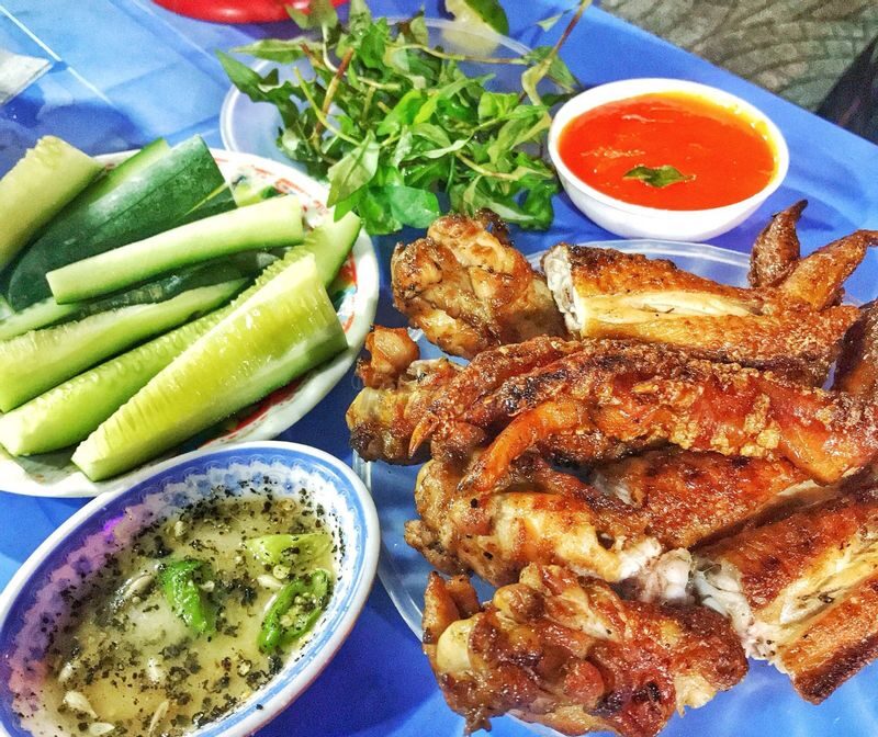 Món gà của quán được tẩm ướp gia vị, sau đó thì ăn kèm với rau răm và dưa leo, điểm nhấn đó chính là muốn tiêu chanh chấm kèm siêu ngon. Đến quán bạn không thể không gọi thử món cánh gà nướng, chỉ một miếng cắn thôi sẽ làm bạn xiêu lòng.