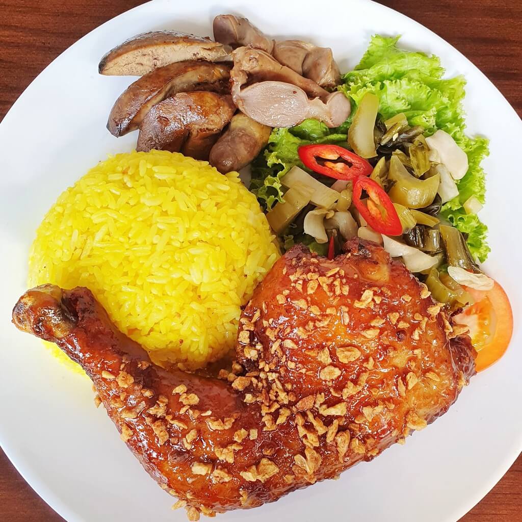 Cơm gà vàng óng, ăn kèm thịt gà được chiên giòn, phủ bên ngoài là lớp bột có độ dày vừa phải, phủ sốt đậm đà thơm ngon. Ngoài thịt gà, phần cơm còn được bổ sung thêm dưa chuột, củ cải và cà rốt muối chua giúp giảm ngán khi ăn. Menu quán cũng khá đa dạng các món, nổi trội là món cơm gà chiên xù và cơm gà nướng tỏi thơm ngon. Sử dụng combo các món được quán bày bán cũng sẽ giúp thực khách tiết kiệm chi phí hơn.