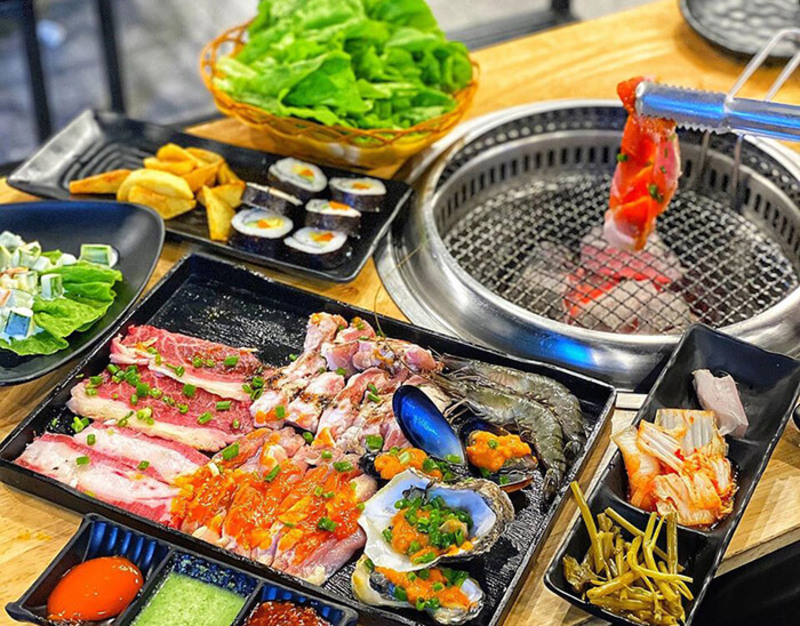 Món ăn ở đây thì phải nói là nhiều vô kể nhìn thôi đã thích mắt, tất cả đều được tẩm ướp kỹ càng chỉ chờ để phục vụ thực khách, có nhiều món ăn được kể tới đó là thịt bò tảng, thịt bò ba chỉ quấn nấm, hay các loại hải sản cũng được đưa ra để phục vụ thực khách.