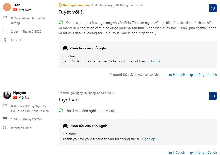 Bạn đọc có thể tham khảo những đánh giá dưới đây để có cái nhìn khách quan về chất lượng dịch vụ của Radisson Resort Cam Ranh.