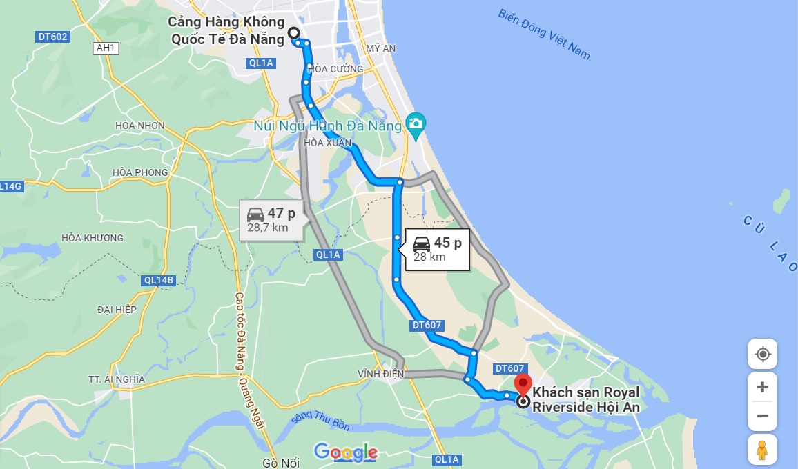 Bạn sẽ mất không đến 1 giờ đồng hồ để di chuyển từ Cảng Hàng không Quốc tế Đà Nẵng đến Royal Riverside Hội An. Bạn có thể lựa chọn giữa nhiều phương thức di chuyển như tự lái xe đến khách sạn và đỗ xe miễn phí tại bãi đỗ xe của khách sạn, hoặc ngồi xe khách đến Hội An rồi tiếp tục đi taxi đến hoặc thuê xe limousine cho cả gia đình hoặc nhóm du lịch.