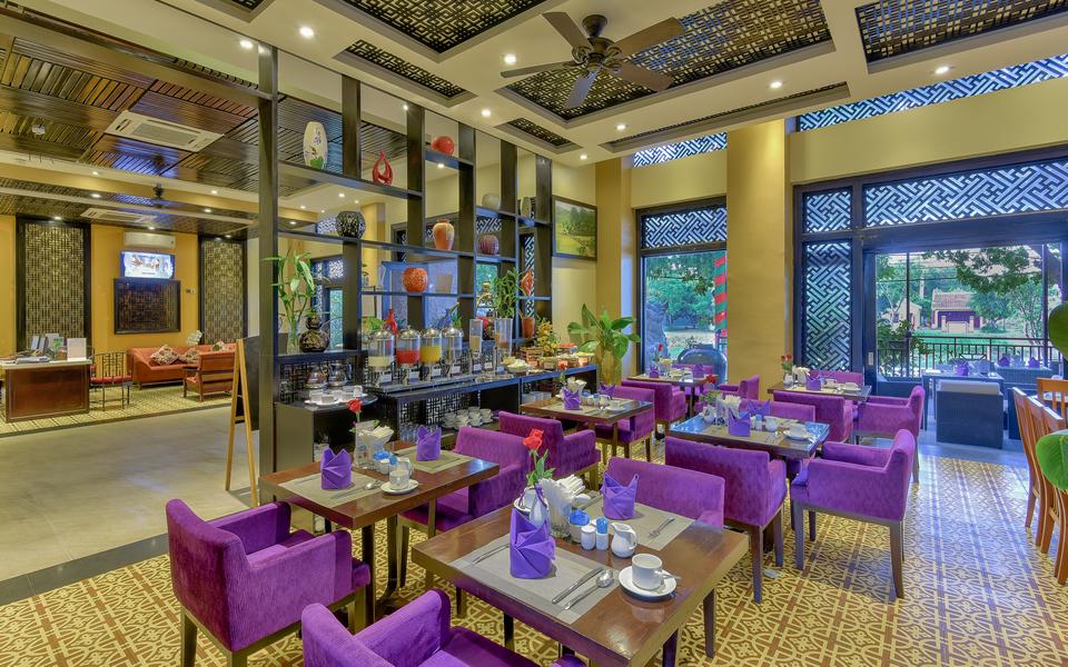 Nhà hàng phục vụ các loại món ăn đa dạng, bao gồm cả ẩm thực phương Tây lẫn các món đặc trưng của Việt Nam nói chung và các món đặc sản của Hội An nói riêng. Thực khách có thể chiêm ngưỡng khung cảnh thành phố náo nhiệt bên ngoài cùng bể bơi trong xanh trong lúc dùng bữa.