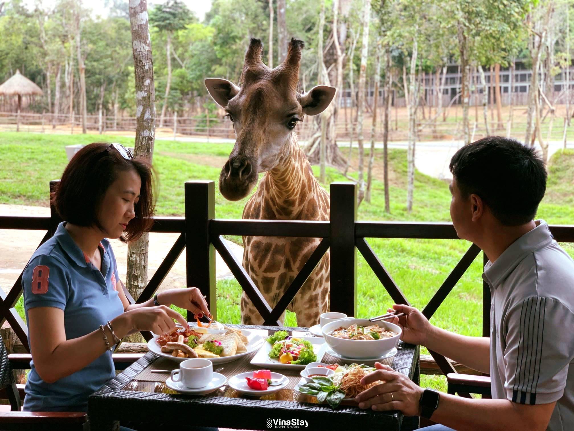 Nằm trong khu rừng xanh mướt, nhà hàng Giraffe là nơi bạn sẽ được tận hưởng những món ăn thơm ngon, những ly nước mát lạnh giữa khung cảnh thiên nhiên hoang sơ, lãng mạn. Trong bữa ăn của mình, bạn sẽ bắt gặp rất nhiều chú hươu cao cổ ghé qua. Tuy nhiên có một lưu ý là bạn không được cho chúng ăn thức ăn của bạn vì hươu cao cổ có thức ăn riêng. Chính vì vậy, nếu muốn cho hươu ăn thì bạn hãy mua phần thức ăn riêng cho chúng nhé!