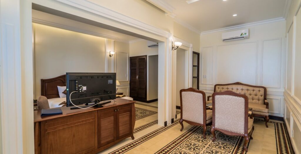 Căn phòng này sở hữu diện tích rộng rãi lên đến 45m2 được sắp xếp, và bố trí đầy đủ những tiện ích sang trọng, đảm bảo cho kỳ nghỉ của du khách được trọn vẹn và hoàn hảo. Những đồ dùng, nội thất được lựa chọn mang đậm nét cổ kính, hệ thống cửa sổ rộng rãi mang đến bầu không khí trong lành tươi mới.
