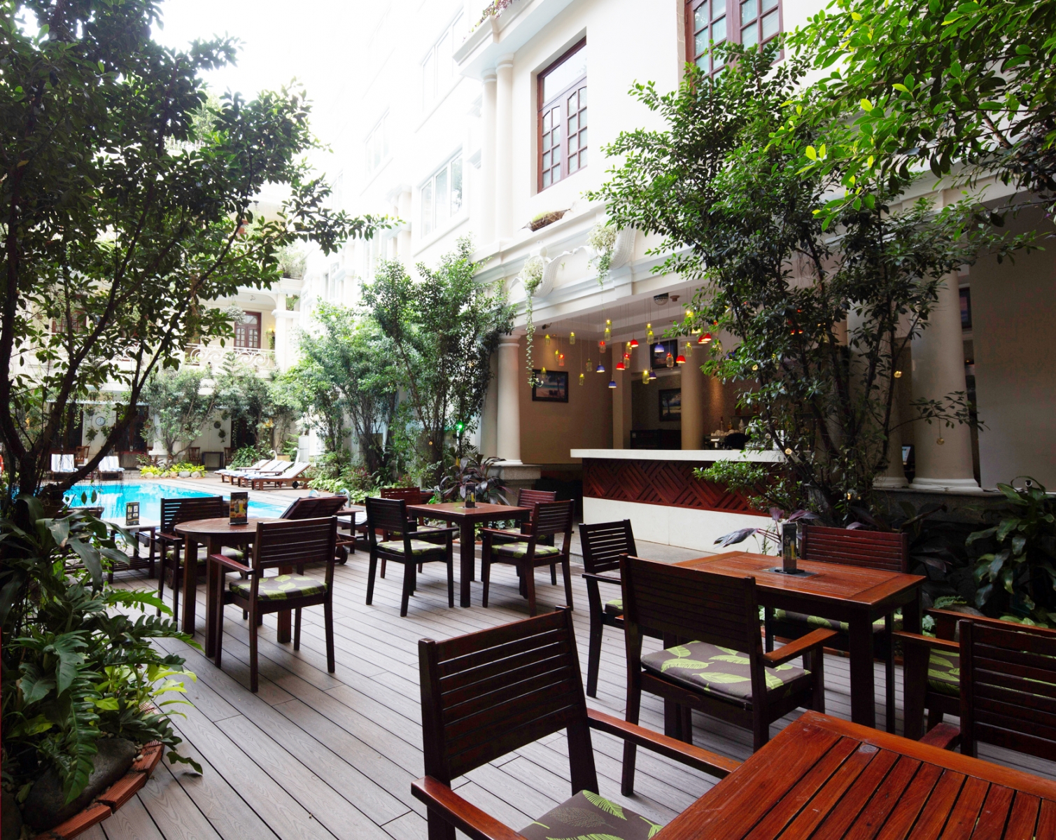 Một không gian lãng mạn khác mà bạn không thể bỏ qua chính là Bar Des Amis Saigon. Đây khu vực nằm ngay cạnh hồ bơi ngoài trời. Vừa nhâm nhi một ly cocktails hay loại rượu hảo hạng, vừa đu đưa theo làn nước mát lạnh, đích thị là trải nghiệm có một không hai chỉ ở Grand Hotel Saigon mới có.