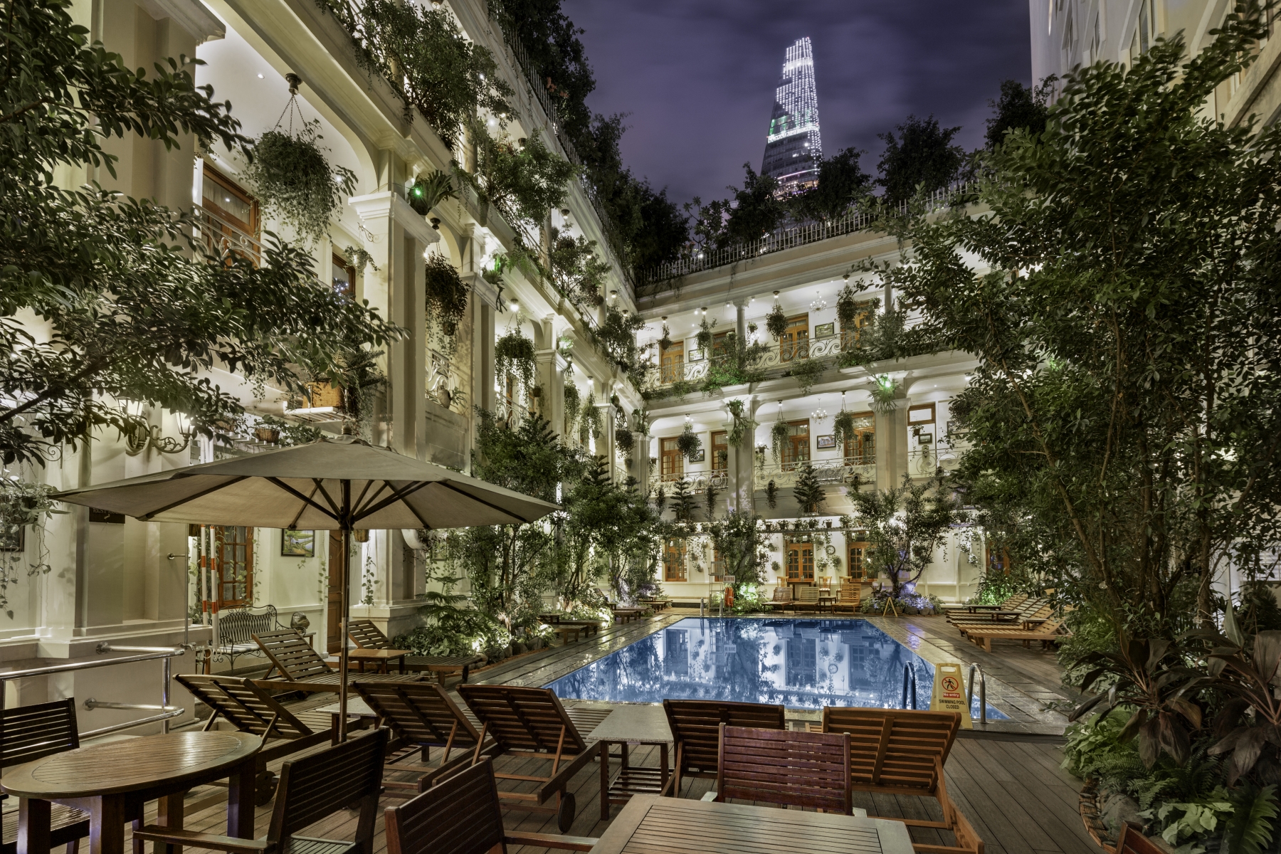 Hồ bơi ngoài trời với lối kiến trúc cổ điển, sang trọng. Như một tấm lụa xanh biếc đặt giữa khu vườn đầy hoa, hồ bơi ở Grand Hotel Saigon không chỉ mang lại cho bạn cảm giác thư giãn mà còn là mơ ảo và cực lãng mạn. Ngay bên cạnh hồ bơi còn có quầy bar rất chill. Bạn vừa có thể ngắm cảnh, thả mình theo dòng nước, nhâm nhi đồ uống tuyệt hảo giữa cung điện nguy nga, tráng lệ.