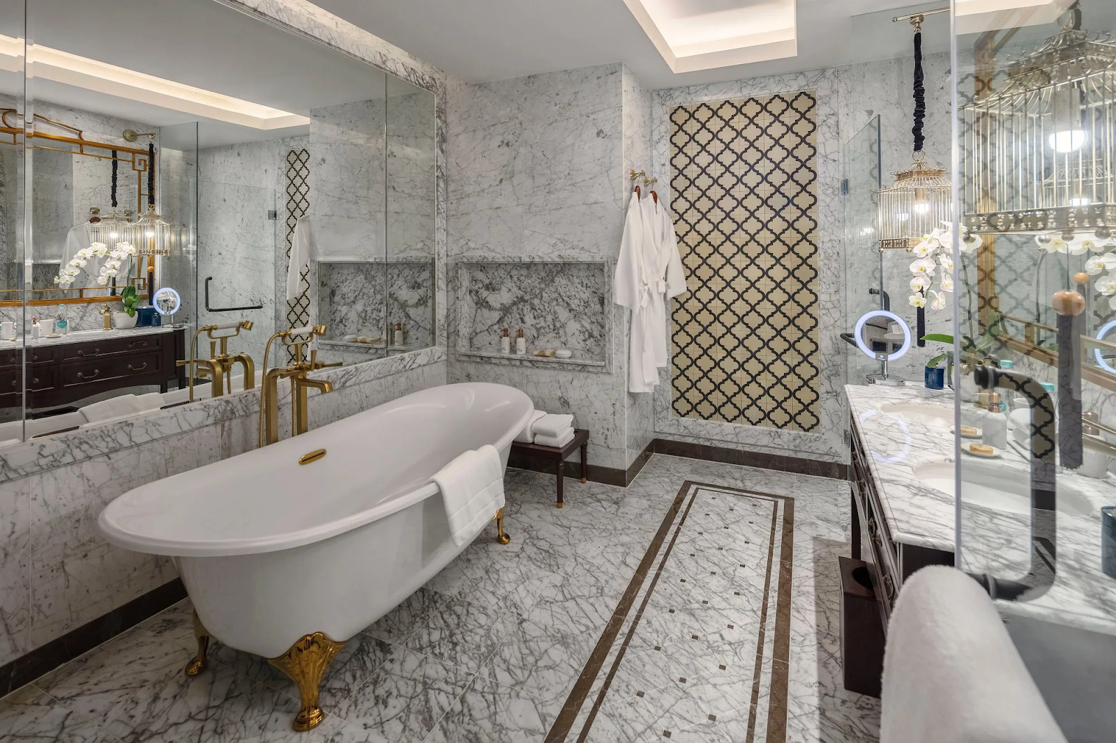 Hạng phòng này có phòng tắm rộng rãi được lát đá sang trọng và điểm xuyết thêm một vài chi tiết mạ vàng lóng lánh, tạo cảm giác xa hoa bậc nhất cho người sử dụng.