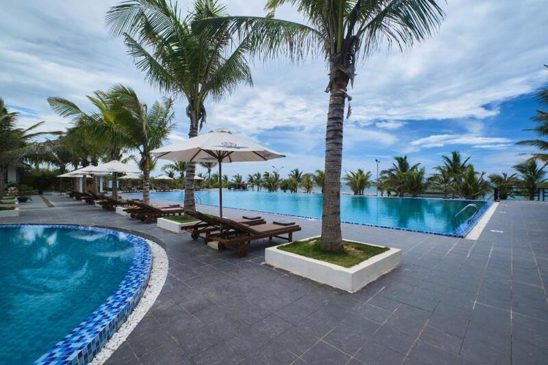 Hồ bơi ngoài trời được bao quanh bởi những rặng dừa cao vút và khung cảnh thơ mộng của biển cả trước mặt. Xung quanh hồ bơi bố trí nhiều ô và ghế dài tắm nắng để du khách nằm thư giãn thoải mái. Không chỉ là một nơi giải trí bơi lội, bể bơi có thiết kế giáp bãi biển còn là địa điểm check-in cực xịn sò.