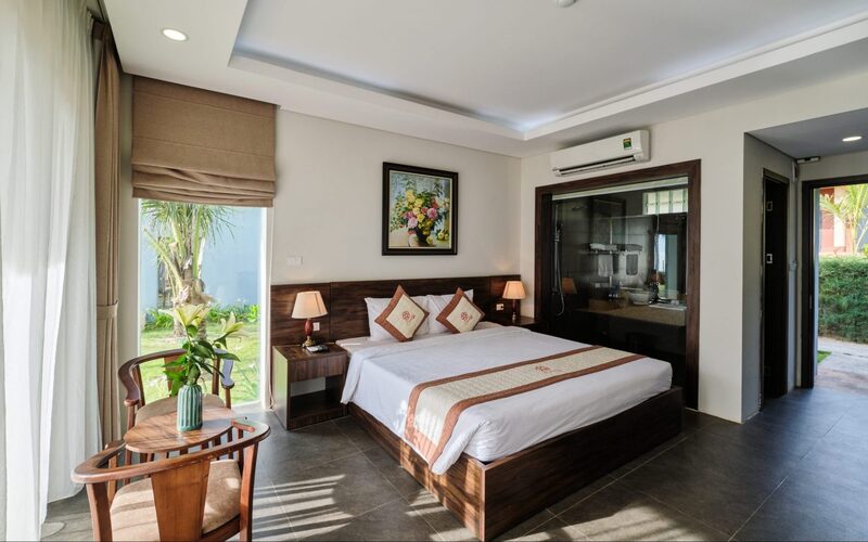 Căn hộ rộng 40m2 bao gồm 2 phòng ngủ sẽ phù hợp nhất cho đoàn khách 4 người như gia đình. Thiết kế sàn nhà bằng gạch đá cao cấp, không gian trang trí tối giản toát lên vẻ sang trọng và tinh tế. Mỗi phòng đều có ban công hướng vườn vô cùng rộng rãi.