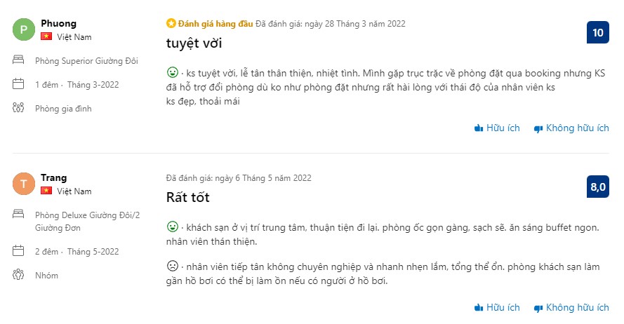 Khách sạn Senna Hue Hotel được nhiều du khách yêu thích và lựa chọn bởi nét đẹp cổ điển, sang trọng cũng như chất lượng dịch vụ hàng đầu. Senna Huế luôn thu hút du khách với nhiều sự lựa chọn về địa điểm lưu trú cũng như đội ngũ nhân viên được đào tạo bài bản, luôn coi trải nghiệm của du khách là yếu tố quan trọng hàng đầu. Dưới đây là một số review, cảm nhận của du khách khi lưu trú tại Senna Hotel Hue: