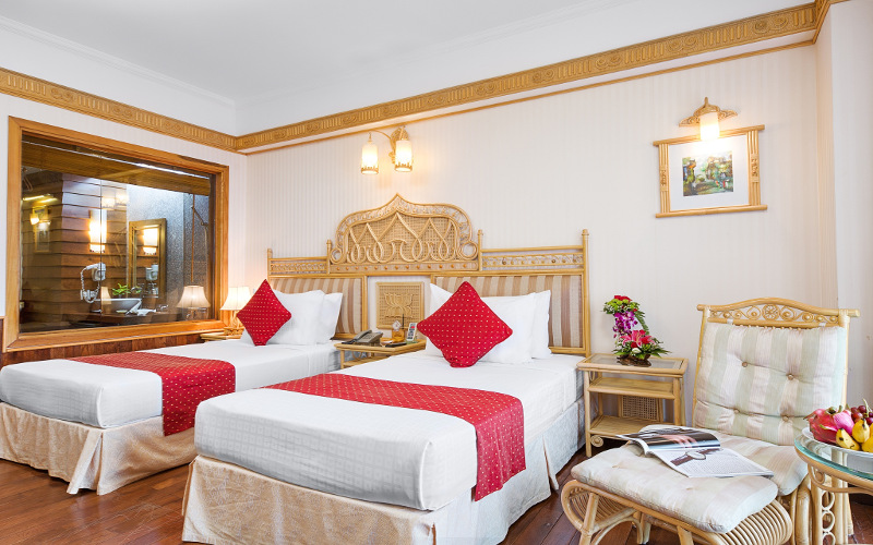 Căn phòng rộng 30m2 gồm 2 giường ngủ đơn. Với lối bài trí đơn giản nhưng phòng vẫn rất đầy đủ tiện nghi phục vụ cho những nhu cầu cơ bản của khách hàng như TV màn hình phẳng, tủ lạnh, tủ đựng đồ, điều hòa, bình nước nóng,…Căn phòng có cửa sổ lớn đón trọn ánh sáng tự nhiên và những làn gió mát lành đưa vào lan tỏa khắp không gian.