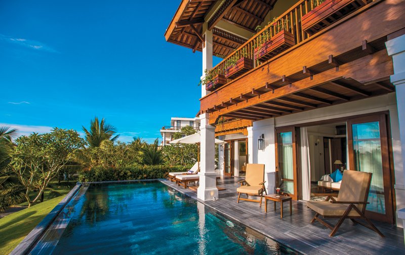 Khu biệt thự được xây dựng 2 tầng với thiết kế gồm 1 phòng khách, 3 phòng ngủ lớn, có thể kê thêm giường phụ nếu du khách có nhu cầu, nhà tắm cùng gian bếp rộng rãi, nội thất, tiện nghi đầy đủ. Và đương nhiên là không thể thiếu một không gian hồ bơi riêng tư, rộng lớn, đảm bảo cảm giác hài lòng về chất lượng villa tại The Anam.
