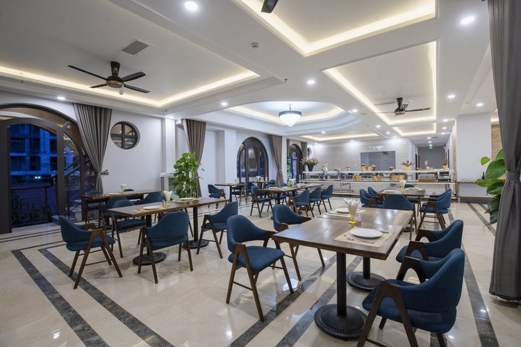 Bữa sáng được phục vụ buffet giúp quý khách có nhiều sự lựa chọn đa dạng hơn. Với view nhìn được ra biển giúp quý khách có thể vừa thưởng thức bữa ăn vừa ngắm nhìn quan cảnh thơ mộng bên ngoài, đầy lãng mạng. Hoặc những cuộc gặp đối tác hoặc bạn làm ăn tại nhà hàng cũng rất lý tưởng.