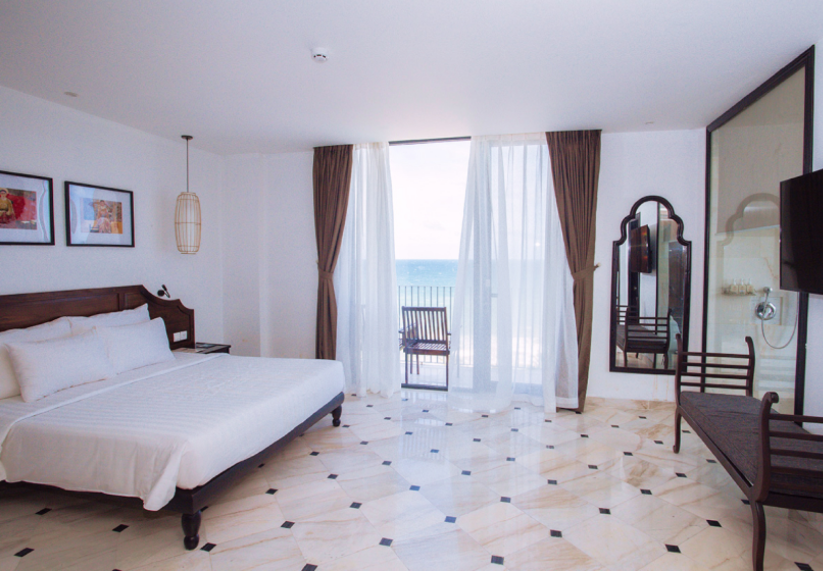 Phòng có diện tích rộng 45m2 với nội thất gồm 1 giường đôi cực lớn, 1 khu vệ sinh mở giữa phòng đem lại trải nghiệm cực thú vị. Phòng có tiện nghi đầy đủ cùng với đồ uống, trà và cà phê miễn phí mỗi ngày. Điểm đặc biệt của phòng là nằm ngay sát biển, có ghế dài phía ngoài sân hiên để bạn có thể nằm thư giãn và ngắm cảnh biển, buổi sáng sẽ bắt trọn ánh bình minh và hoàng hôn chiều tà. Từ phòng đi ra biển cực tiện vì có đường đi riêng từ khu resort ra biển.