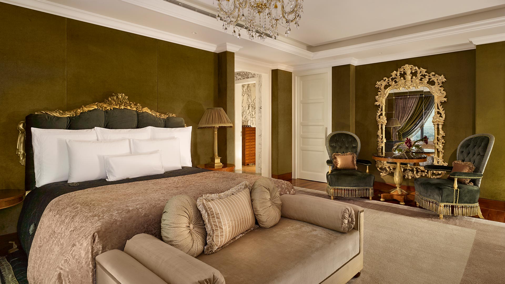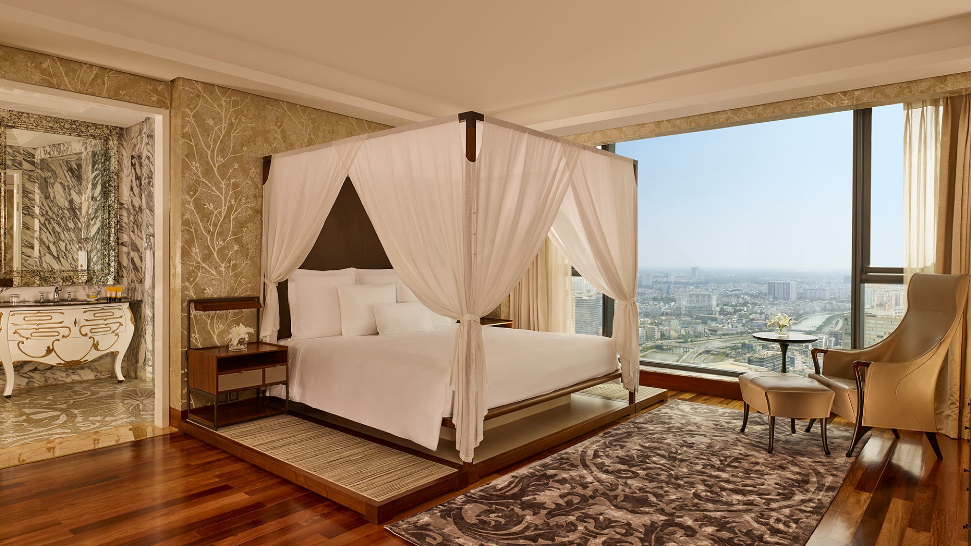 Căn phòng lộng lẫy rộng 126 mét vuông với một không gian rộng rãi, lộng lẫy và yên bình. Nơi đây tạo cảm giác như ở trong chính căn nhà của mình với lối bài trí ấm cúng. Phòng gồm nhiều nội thất sang trọng như đèn chùm thuỷ tinh Murano với nhiều màu sắc, giường cao cấp cho Chi Wing Lo thiết kế hay ghế Progetti của Giorgetti…tất cả cho một không gian vô cùng tinh tế như những món quà dành cho du khách.