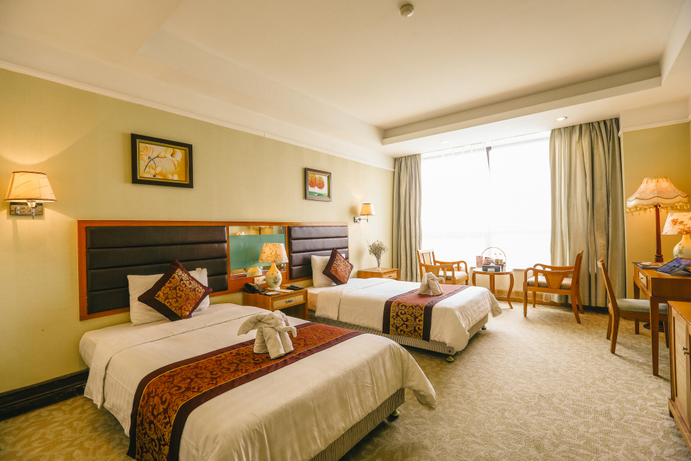 Thiết kế phòng nhấn vào sự đơn giản, mộc mạc mà vẫn không kém phần tinh tế trong tổng diện tích 45m2. Phòng Deluxe Twin được bố trí 2 giường đơn hoặc 1 giường đôi tại phòng ngủ, kèm khu vực tiếp khách và bàn làm việc. Cửa sổ phòng có view hướng ra bể bơi khách sạn lẫn thành phố Ninh Bình mang đến một không gian yên tĩnh và thoải mái.