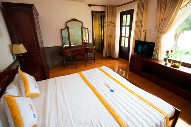 Đây là loại phòng có diện tích khoảng 32m2 và được trang bị giường đôi King Size cỡ lớn. Phòng được trang bị đầy đủ các tiện nghi: điều hòa không khí, minibar, phòng tắm riêng, TV màn hình phẳng, bình đun nước siêu tốc,… đảm bảo bạn có chuyến lưu trú thoải mái. Hướng vườn của phòng nhìn ra vườn cây xanh của resort.
