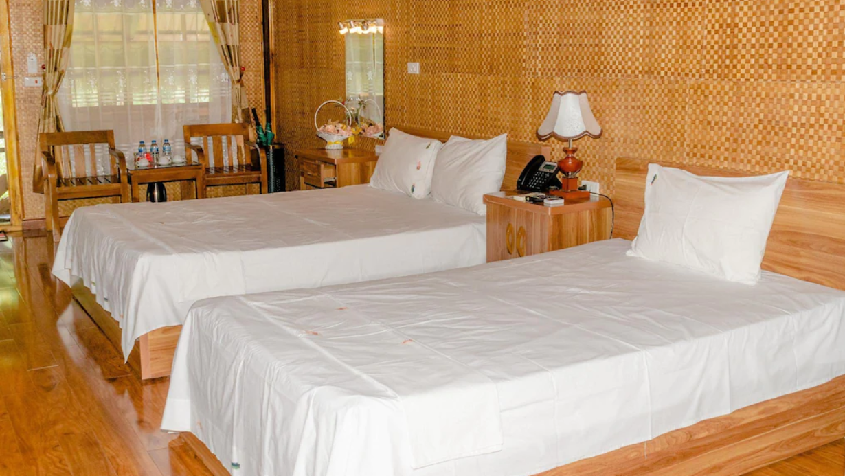Phòng rộng rãi với diện tích 35m2 được bố trí 3 giường đơn với sân hiên và ban công rộng có chuẩn bị bàn ghế gỗ để ngồi ngắm cảnh và thư giãn. Phòng đầy đủ tiện nghi được chuẩn bị chu đáo, nội thất tinh tế, đơn giản với các sản phẩm làm từ tre, nứa đem tới cảm giác thoải mái dễ chịu cho du khách khi nghỉ ngơi lại.