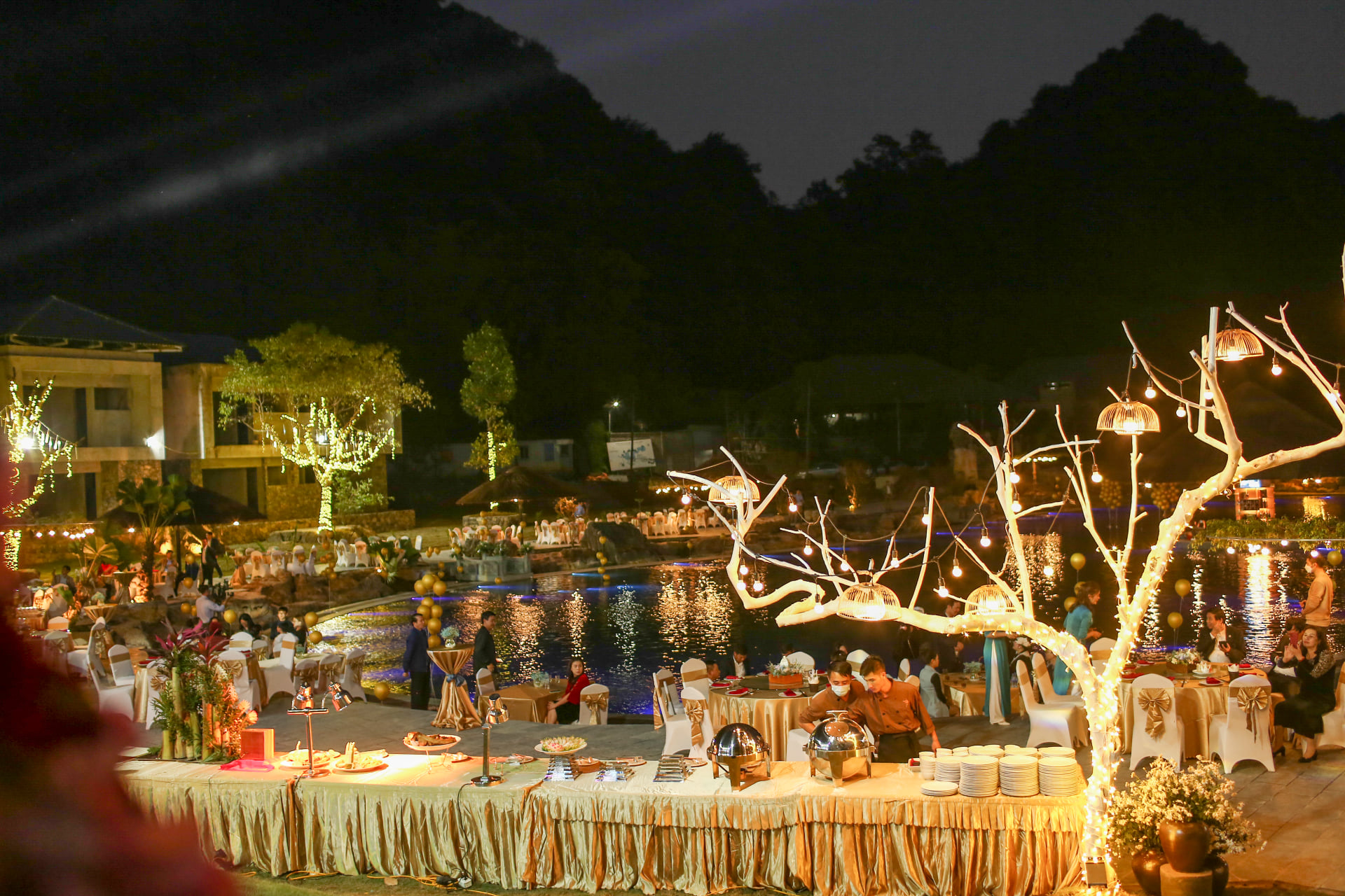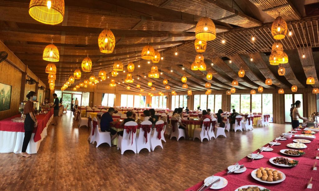 Bên cạnh khu vực ngoài trời, Thung Nham Resort còn có không gian tổ chức tiệc trong nhà rộng rãi với sức chứa hơn 200 khách.Không gian rộng rãi với nhiều cửa kính giúp du khách vừa thưởng thức tiệc vừa ngắm cảnh.