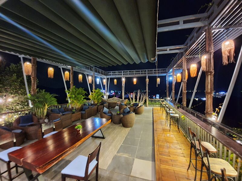 Bar nằm trên sân thượng lầu 5 của khu resort. Bạn có thể chiêm ngưỡng toàn cảnh biển, núi rừng của vùng đảo xinh xắn này, từ những khung cảnh sôi động, náo nhiệt đến những khung cảnh yên tĩnh đến lạ, mang đến cho bạn nhiều cung bậc cảm xúc khác nhau. Đây nhất định là khu vực ngắm cảnh về đêm đẹp nhất tại Tom Hill Resort & Spa Phú Quốc.