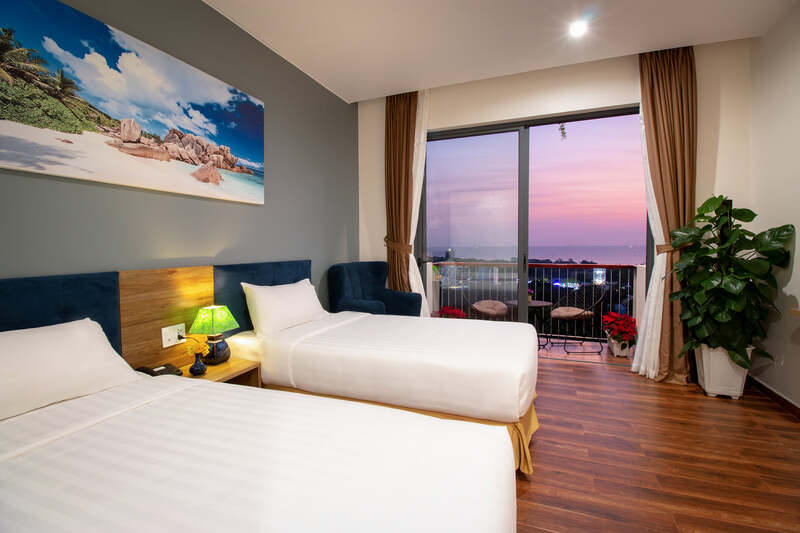Căn phòng rộng 50m2 có thể ở 2 người lớn và 1 trẻ em với view hướng biển thoáng mát qua ô cửa kính toàn phần. Trong phòng có nhà vệ sinh riêng được đặt đầy đủ các đồ dùng cần thiết cho khách hàng nên rất tiện lợi. Căn phòng được trang trí khá đơn giản nhưng vẫn có đủ dịch vụ hoàn hảo.