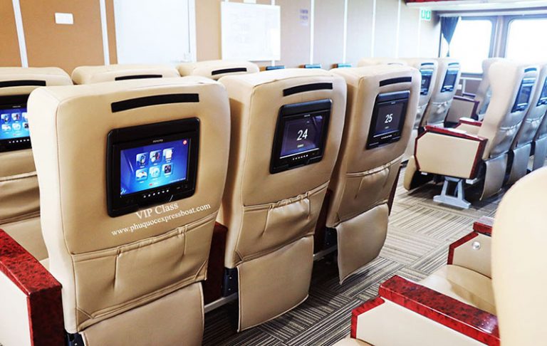 Tàu Phú Quốc Express có chất lượng phục vụ 5 sao với thiết kế theo tiêu chuẩn châu Âu, có tính ổn định cao, boong tàu thoáng giúp hạn chế chứng say sóng cho du khách. Tàu được chia ra làm 2 khoang, khoang VIP được trang bị nội thất là những chiếc ghế bằng da thật, có khả năng ngả 130 độ, được gắn màn hình giải trí riêng cho du khách thư giãn. Ngoài ra, còn có boong ngoài trời cho du khách ngắm cảnh thiên nhiên biển đảo.