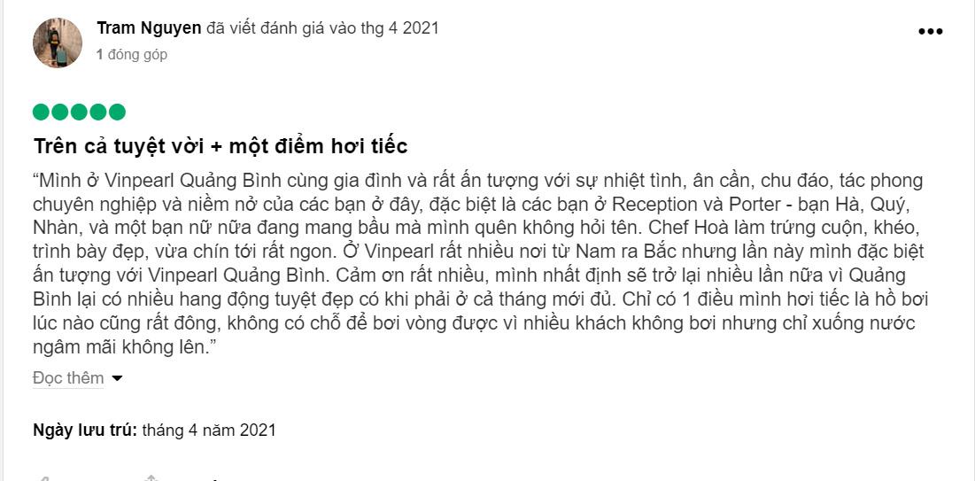 Những phản hồi của khách hàng khi đến với Vinpearl Quảng Bình đều đưa ra những nhận xét rất tốt. Từ chất lượng dịch vụ cho tới các tiện nghi cao cấp đều được đáp ứng đầy đủ mang đến sự hài lòng tuyệt đối cho du khách khi đến đây công tác hay nghỉ dưỡng. Hơn thế nữa, đội ngũ nhân viên luôn tiếp đón nhiệt tình, phục vụ khách hàng bằng cả cái tâm của mình. Nên hình ảnh những người dân nơi đây luôn để lại những ấn tượng rất tốt trong lòng mỗi du khách.