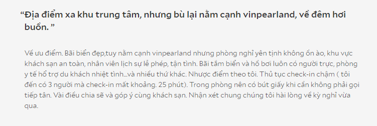 Vinpearl Resort & Spa Phú Quốc được đánh giá là một trong những khu nghỉ dưỡng đáng đến nhất trên đảo ngọc. Chất lượng dịch vụ đảm bảo đáp ứng tiêu chuẩn 5 sao quốc tế, thái độ nhân viên chuyên nghiệp và luôn sẵn sàng giúp đỡ du khách. Sau đây là một đánh giá tổng quát trên trang booking trực tuyến về khu nghỉ dưỡng và một số review chi tiết của khách hàng