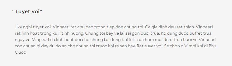 Vinpearl Resort & Spa Phú Quốc được đánh giá là một trong những khu nghỉ dưỡng đáng đến nhất trên đảo ngọc. Chất lượng dịch vụ đảm bảo đáp ứng tiêu chuẩn 5 sao quốc tế, thái độ nhân viên chuyên nghiệp và luôn sẵn sàng giúp đỡ du khách. Sau đây là một đánh giá tổng quát trên trang booking trực tuyến về khu nghỉ dưỡng và một số review chi tiết của khách hàng