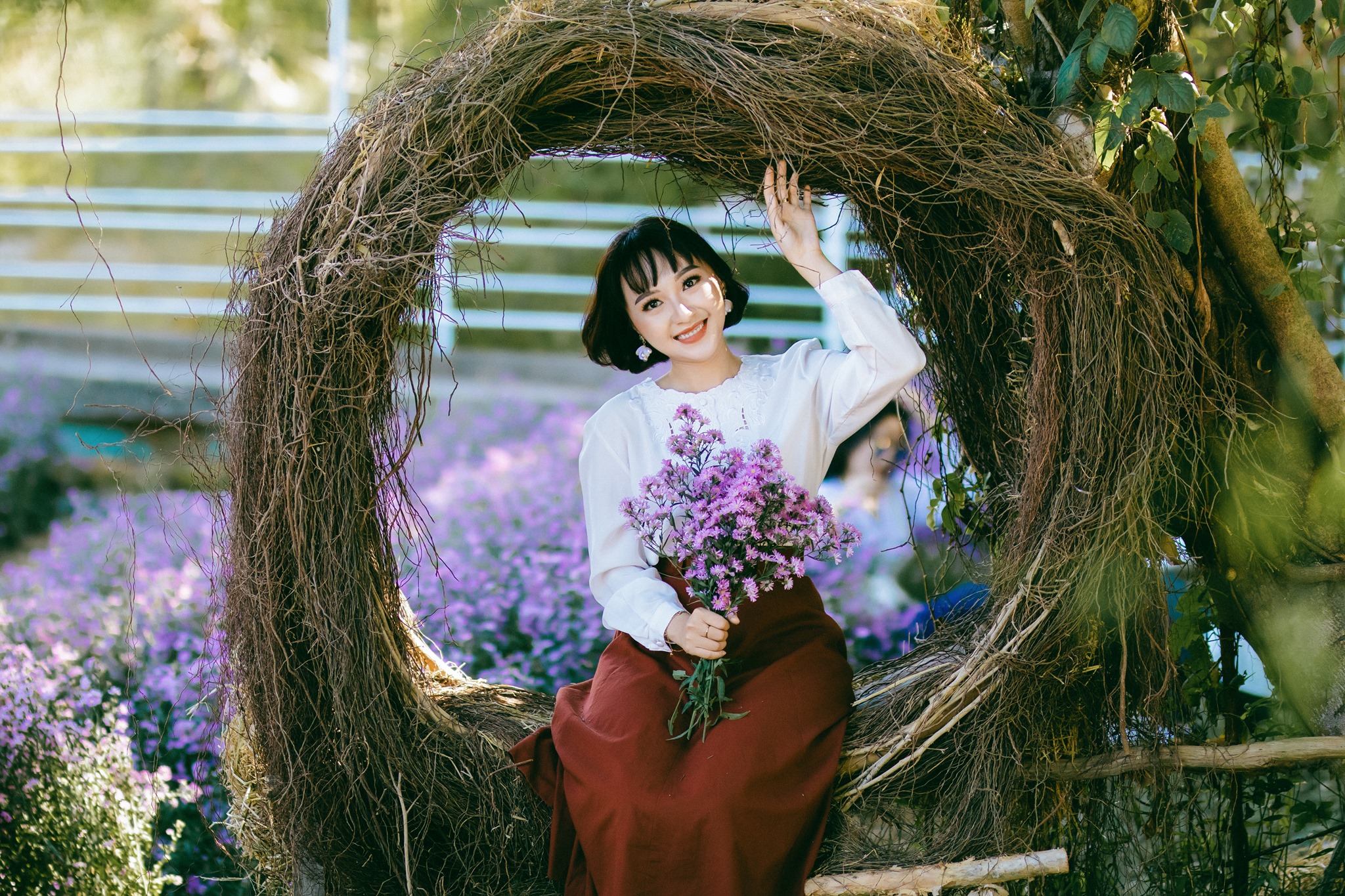 Và để tăng thêm sự sinh động, mới mẻ cho vườn hoa thì những túp lều được dựng bằng gỗ nhỏ xinh, đáng yêu cũng được dựng lên trong khu vườn. Bạn có thể tạo dáng bên túp lều gỗ trong sắc tím mộng mơ của hoa thạch thảo cũng rất độc đáo. Hay check-in bên khung tròn được dựng từ rễ cây, dây leo.