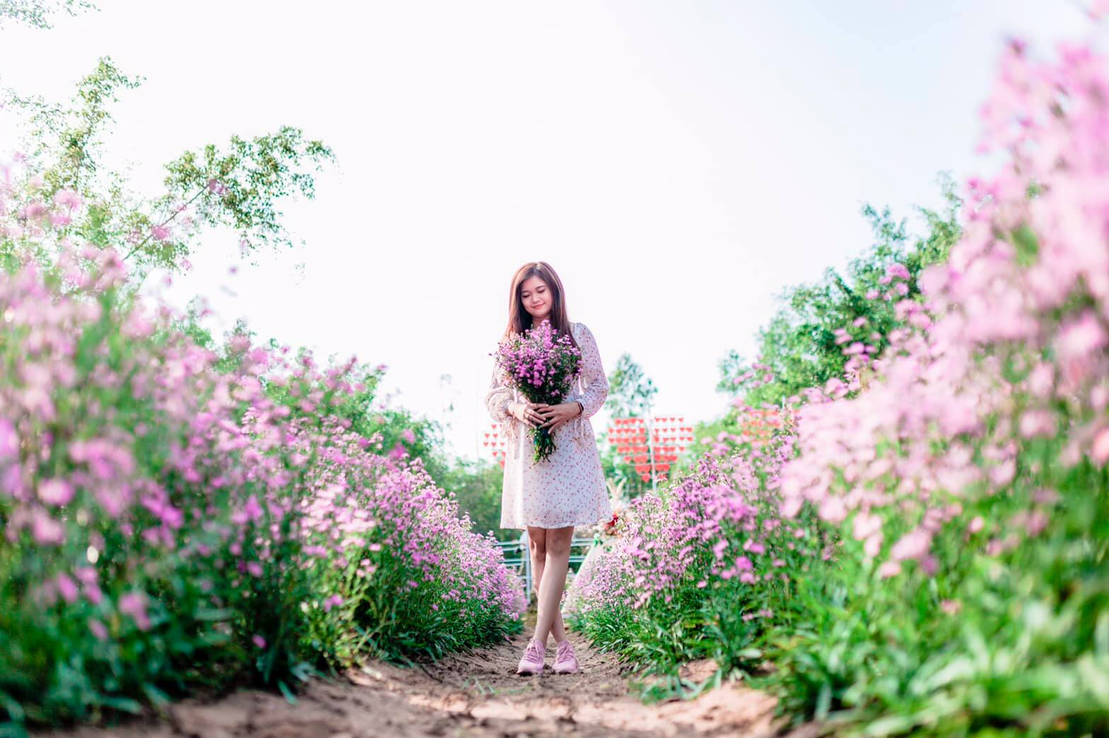 Một chiếc váy đơn giản, nhẹ nhàng và đứng bên cạnh vườn hoa thạch thảo Cần Thơ cũng có thể  biến những cô gái trở thành những nàng thơ yêu kiều mà ai cũng phải trầm trồ ngợi khen.
