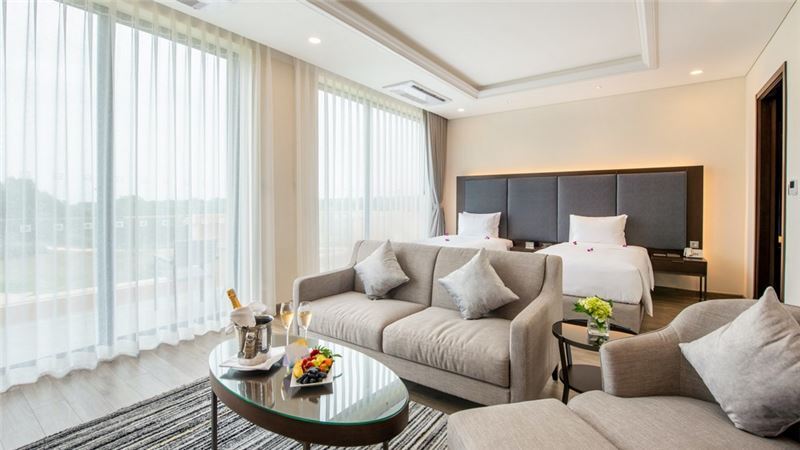Phòng có diện tích rộng lớn lên tới 76m2 với phong cách trang trí mang đậm những nét kiến trúc sang trọng của phương Tây nhưng không kém phần tiện nghi, ấm cúng. Phòng được trang bị 2 giường đôi cùng bộ bàn ghế sofa riêng vừa là nơi để tiếp khách, vừa là nơi để nghỉ ngơi, thư giãn, uống trà, xem TV, trò chuyện, sinh hoạt chung giữa cả gia đình.