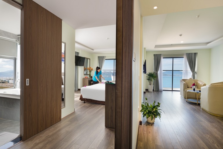 Phòng rộng 40m2 có một giường đơn cho 2 người lớn, phù hợp với một cặp đôi. Căn phòng vẫn được thiết kế đầy đủ tiện nghi như những căn phòng khác của Xavia Hotel Nha Trang. Đặc biệt, Phòng Suite có 2 chiếc cửa kính lớn với hướng nhìn toàn cảnh bãi biển Nha Trang tươi đẹp. Từ chiếc giường ngủ êm ái, bạn cũng có thể ngắm nhìn mọi khoảnh khắc trên biển và cảm nhận điều đó theo cách riêng của bạn.